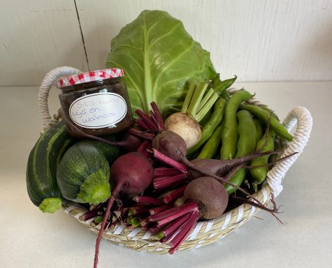 De manden en dienbladen worden gevuld met datgene wat op dat moment op de tuin aanwezig is.Wij kunnen deze prachtige manden maken zolang er nog genoeg groente uit de tuin komt.Aan het einde van het seizoen houd het weer op.