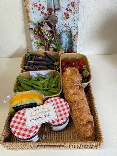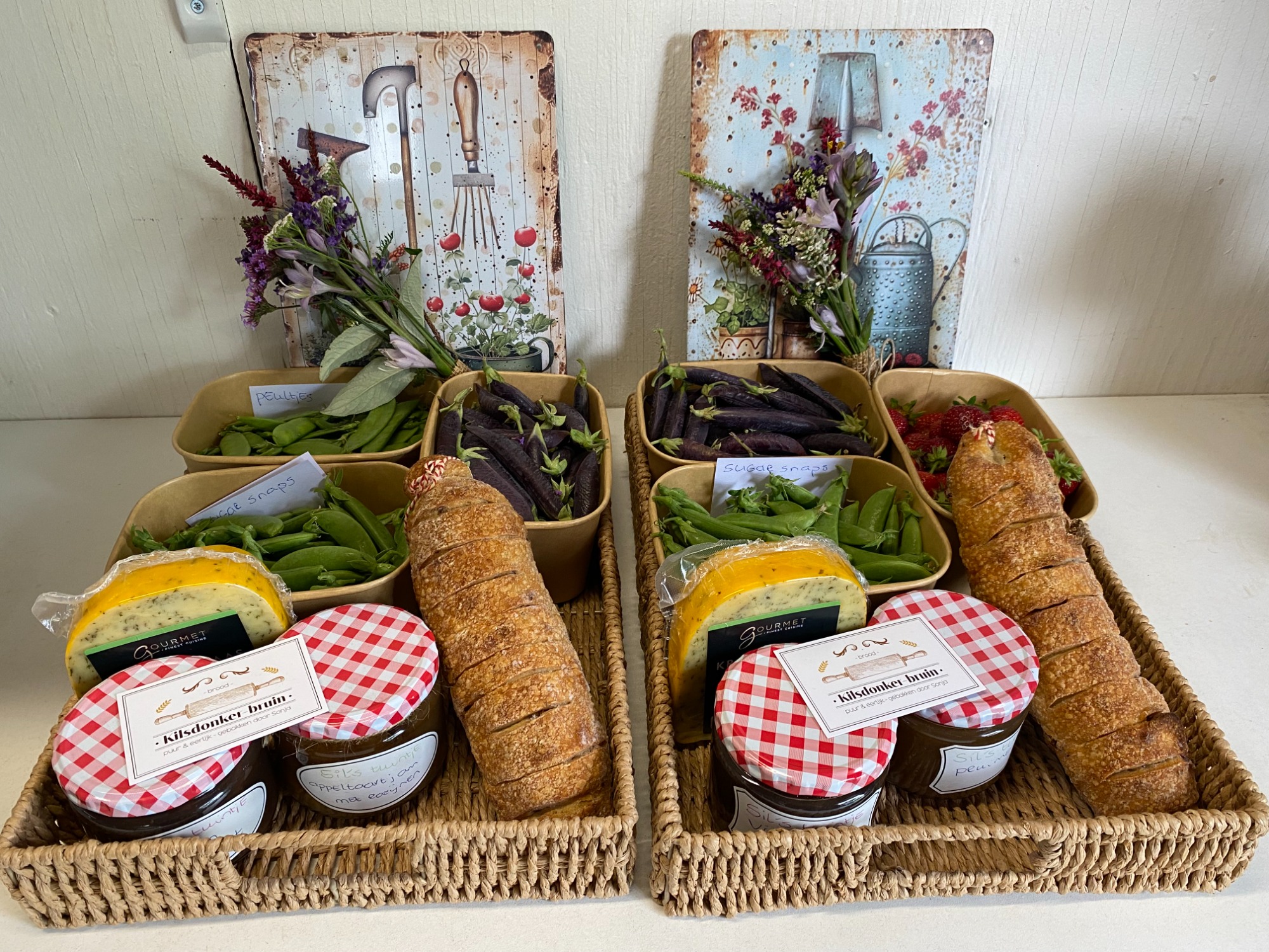 De ronde rieten manden zijn gevuld met onze eigen heerlijke verse onbespoten groente eventueel met een jampotje erbij.(Zie de 2 eerste foto's,het zijn voorbeeldfoto's)De grotere dienbladen zijn naast de heerlijke,verse groente ook gevuld met wat lekkers voor bij de borrel,oa een borrelbroodje,borrelkaas en zelfgemaakte vijgenjam die perfect is voor bij een stukje kaas.Om het helemaal af te maken zit er een mooie landelijk metalen wandbord bij en ,als er is, een mini boeketje uit onze tuin.
